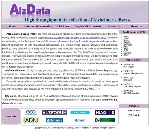 近日,中国科学院昆明动物研究所姚永刚课题组的研究论文 A systematic integrated analysis of brain expression profiles reveals YAP1 and other prioritized hub genes as important upstream regulators in Alzheimer's disease 发表在 Alzheimer's & Dementia 杂志上。该研究利用整合分析的方法,总结了阿尔茨海默病(Alzheimer's disease, AD)的脑组织基因表达谱及其遗传易感基因名录,并搭建了 AlzData(www.alzdata.org) 数据库,以促进 AD 研究领域相关数据的共享和利用。