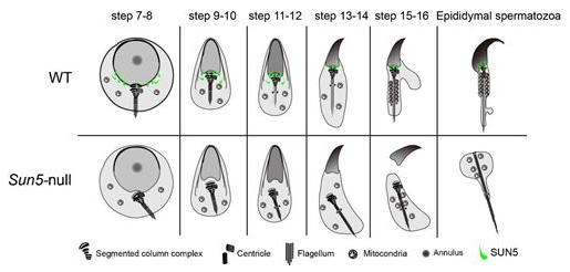 Sun5 缺失导致精子身首异处模式图精子作为携带雄性遗传物质的关键载体,其形态、活力、完整性对雄性生殖力至关重要。人类无头精子症的报道已有几十年历史,典型症状是精液中精子只具有能运动的尾部及小团胞质,从而导致男性不育。中国科学院动物研究所李卫研究组通过 CRISPR/Cas9 技术构建 SUN5 敲除的小鼠,发现 SUN5 的缺失不影响雌性生殖力,却导致雄鼠不育。初步研究发现,缺乏 SUN5 的精子与人类的圆头精子症非常相似。进一步研究发现,这些精子的头部没有顶体也没有细胞核。因而事实上是一类无头精子,所有“精子”只含有能够摆动的尾部及未移除的少量胞质。经过小鼠模型中的超微结构观察发现,SUN5 缺失之后,尽管精子头尾连接装置(Head to tail coupling apparatus, HTCA)可以正常组装,但在精子变形之初 HTCA 就从精子核膜植入窝(implantation fossa)处分离。随着精子不断延长,最终 HTCA 连同精子尾巴一起从精子头部脱落,产生没有受精功能的无头精子。该小鼠模型的表型与一些人类无头精子症高度类似。研究发现,SUN5 精确定位在精子头尾连接处,并且这一定位在人、小鼠及多种哺乳动物中高度保守。同时,安徽医科大学曹云霞研究组在临床研究中,通过对无头精子症患者进行外显子测序发现了 SUN5 基因 10 个位点的突变。实验动物模型和临床发现均提示,SUN5 突变很可能是无头精子症的重要致病因素。由于这类精子依然能够运动,极易与临床上的另一类畸形精子症——圆头精子症混淆,因而将此类无头精子症命名为“伪圆头精子症”,以提醒在临床上切勿将此类无头精子症与圆头精子症混为一谈,从而造成错误诊断和错误治疗。在此基础上,研究人员通过仔细寻找不能运动的精子头部而不是能够运动的精子尾部,利用这些脱落的精子头使卵子受精,最终产生健康的后代,从而克服了困扰这一类不育患者的难题。该项研究来源于临床科学问题,通过基础研究手段进行了系统解答,并最终返回到临床上解决了部分男性患者的不育难题。相关研究近日发表在 eLife 杂志上,研究工作获得了国家重点研发计划和国家自然科学基金等的支持。https://elifesciences.org/articles/28199 动物所揭示Sun5异常导致无头精子症分子机制
