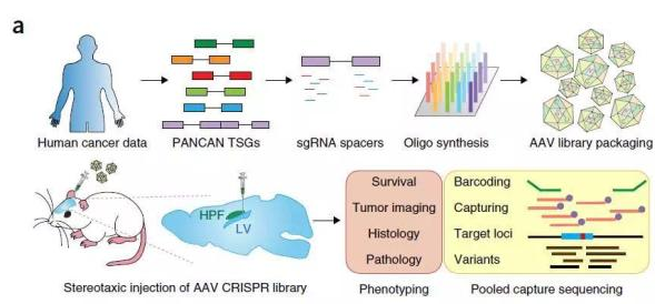 为了寻找到会导致胶质母细胞瘤的基因突变,Chen 教授团队利用 CRISPR 基因编辑技术,开发了一种全新的筛选手段。首先,他们在数据库中找到了人类脑癌中常见的基因突变,并由此构建了一套 sgRNA 库,用于 CRISPR 编辑。随后,他们使用了腺相关病毒(AAV)技术,将这些能突变特定基因的系统引入到了小鼠脑内。之后,他们观察这些小鼠是否会出现胶质母细胞瘤的症状。由这些发病的小鼠,研究人员能反推出哪些基因突变会诱发这种致命脑瘤。
