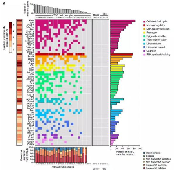 如他们所料,不少小鼠都出现了胶质母细胞瘤。对于这些大脑组织的后续测序分析,研究人员们发现一些基因突变特别常见。Pten、Nf1、B2m、Trp53 等参与到细胞周期、免疫调控、以及 DNA 修复与复制的基因,突变的频率更是要超过 70%。这些结果表明了这些基因在胶质母细胞瘤的病发中或许起到了关键作用。