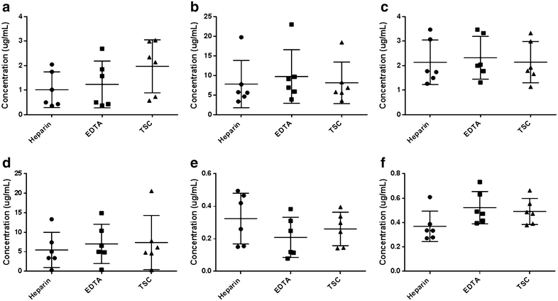 背景:药代动力学研究是药物开发和优化的关键。虽然血液样本可以收集在EDTA,肝素或含柠檬酸的试管用于估计血浆中的药物水平,但更常用的是EDTA管。本研究的目的是探讨抗凝剂对生物药物的影响。选择六种广泛应用于癌症治疗的药物。Wistar大鼠(n = 6 /每种药物)培美曲塞(50毫克/公斤),伊马替尼(50毫克/公斤),厄洛替尼(25毫克/公斤),美罗培南(60毫克/公斤)6-巯基嘌呤(20 mg/kg)和伏立康唑(6毫克/公斤)。给药后2h,从眼眶后静脉采集血液样本。血液收集在含EDTA、肝素,柠檬酸钠(TSC)和无抗凝管中。通过高效液相色谱分析测定这些样品中的药物水平。单因素方差分析和图基检验确定抗凝管药物浓度的统计学差异。p<0.05被认为具有统计学意义。结果:厄洛替尼和美罗培南的抗凝管浓度差异有显著性,而培美曲塞呈临界统计学意义。TSC管高估了厄洛替尼的水平,肝素管低估了美罗培南的浓度,EDTA管高估了培美曲塞的浓度。结论:仔细挑选抗凝剂对准确地描述药物的药代动力学是必需的。常规使用EDTA管可能导致药代动力学数据的错误解释。关键词:抗癌药物 生物分析 血浆 抗凝血剂 药物(代谢)动力学 治疗药物监测背景:适当地选择、取样和储存用于估计药物水平的生物样本是很重要的,但在日常实践中有时会被忽视。血液是最重要的临床标本之一,因为它提供了独特的优势,大量公布的数据为动物死亡前和死亡后药物浓度分析,从药理学角度看模型的解释价值。血液样本可以在试管中收集,有多种防腐剂、抗凝剂和其他添加剂的选择,随后储存在室温、冷藏或冷冻中。其目的显然是维持样品及其感兴趣的药物或代谢物在从收集时间到分析时间不会降解。药物测试实验室必须开发样本分析的方法,以便对数据进行准确的估计和解释。例如,药物与所用收集管的类型之间的相互作用并不少见,应在分析方法开发过程中加以说明。在临床试验和常规病人护理中准确测定人体血液样本中的药物水平是极其重要的。例如,治疗药物监测(TDM)根据先前剂量的水平指导药物的进一步剂量选择。如果剂量根据错误报告的药物水平进行修改,它可能导致亚治疗水平或潜在毒性。抗癌药物和一些抗微生物治疗窗窄、高毒性,分析物的适当测定对TDM至关重要。EDTA、肝素,柠檬酸钠(TSC)是常用的抗凝剂。然而,文献中没有广泛报道抗凝剂对血药浓度测量的影响。因此,我们研究了三种常用抗凝剂,EDTA,肝素和柠檬酸对六种常用药物在癌症治疗中血浆药物浓度的影响。方法:动物:任一性别的Wistar大鼠(体重范围250± 20g)被用于研究。实验室保持在标准温度条件下(25±2°C)和相对湿度(55±10%)。动物进行12:12 h光暗周期。动物饲养在标准笼具中,并适应一周。试验方案:选择治疗肿瘤常用的六种药物:6-巯基嘌呤(6-MP),,美罗培南,厄洛替尼,伊马替尼,伏立康唑和培美曲塞。Wistar大鼠(n = 36)随机分为六组,各组均腹腔注射50毫克/公斤的培美曲塞,50毫克/公斤的伊马替尼,25毫克/公斤的厄洛替尼,60毫克/公斤的美罗培南,20毫克/千克的6-巯基嘌呤和6毫克/千克的伏立康唑。给药后2小时,从眶后丛静脉取血。由于半衰期短,6-巯基嘌呤在给药后1h取血。根据文献资料,确定了采集剂量和时间点,并报告这些药物在大鼠体内的半衰期,使药物浓度在我们的HPLC分析的线性范围内。每只动物的血样采集在三个含有不同抗凝剂的试管,即肝素、EDTA、TSC和第四个不含任何抗凝剂收集管中。采集后,每个集合管于3000 rpm离心分离血浆,室温条件下使用高效液相色谱法进行进一步分析药物的浓度。样品准备:伊马替尼:1000ul ACN加入100uL血浆中。涡旋5分钟,然后在室温下以15000 rpm离心10分钟,900uL上清液随后在40度干燥35min。完全干燥之后,加入预混液100uL(ACN 80%,水20%),涡旋5分钟,并于15000 rpm离心10分钟。90uL上清液转移到自动进样瓶和30uL注入高效液相色谱仪中。厄洛替尼:1000ul ACN加入100?L血浆中。涡旋5分钟,然后在室温下以15000 rpm离心10分钟,900uL上清液随后在40度干燥35min。完全干燥之后,加入预混液100uL(ACN75%,水25%),涡旋5分钟,并于15000 rpm离心10分钟。90uL上清液转移到自动进样瓶和30uL注入高效液相色谱仪中。6-巯基嘌呤:100uL血浆与50uL DTT(75mg/ml溶于水中)、25uL水和25uL高氯酸混合。涡旋5分钟,然后在室温下以15000 rpm离心10分钟。150uL上清液放在水浴锅中(100°C)45分钟,然后冷却至室温,转移到自动进样瓶和30uL注入高效液相色谱仪中。伏立康唑: 800ul ACN加入100uL血浆中。涡旋5分钟,然后在室温下以15000 rpm离心10分钟,100uL上清液加入100ul缓冲液(10 mM醋酸铵,pH 5),涡旋2 min后在15000 rpm离心10分钟。100uL上清液被转移到自动进样瓶和50uL注入高效液相色谱仪中。美罗培南:固相萃取是用固相萃取柱进行的。固相萃取柱用1 mL甲醇后用1毫升的平衡缓冲液冲洗。血浆(100uL)被装入萃取柱。二次洗涤用500uL平衡缓冲液(pH 6.2)进行。然后将样品用500ul 100%乙腈洗脱液洗脱后进行干燥。样品与100uL预混液混合,涡旋2分钟后,12000转离心。90uL的样本被装入HPLC小瓶和30uL加入柱中。培美曲塞:固相萃取是用固相萃取柱进行的。固相萃取柱用1 mL甲醇后用1毫升的平衡缓冲液平衡洗。血浆(100uL)被装入萃取柱。二次洗涤用500uL平衡缓冲液(pH 6.2)进行。然后将样品用500ul 100%乙腈洗脱液洗脱后进行干燥。样品与100uL 100 mM K2HPO4 (pH 6.2)预混液混合,涡旋5分钟后,15000转离心10min。90uL的样本被装