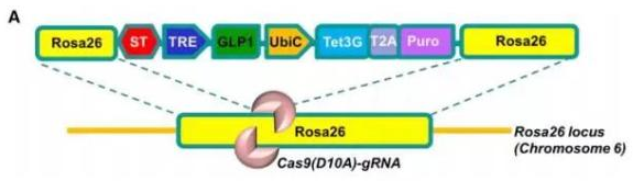 使用 CRISPR 基因编辑手段,这支团队改造了编码胰高血糖素样肽 1(GLP1)的基因,引入了一个能显著提高其半衰期的突变。随后,他们将这条基因接在了一个抗体基因片段上,并在前头安上了一个受多西环素(doxycycline)诱导的启动子。按照他们的设计,如果这个基因片段能正常工作,那么在多西环素的诱导下,基因会进行表达,产生与抗体片段相融合的 GLP1。在抗体片段的作用下,它能随着血流进行循环,促进胰岛素的分泌,从而起到控制糖尿病的作用。