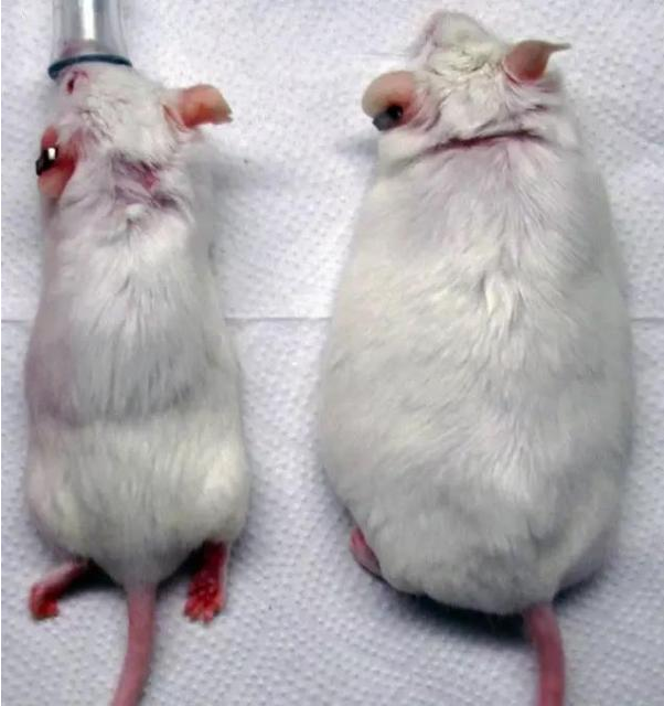 ▲在诱导剂的作用下,接受基因疗法的小鼠(左)并没有吃胖(图片来源:《Cell Stem Cell》)