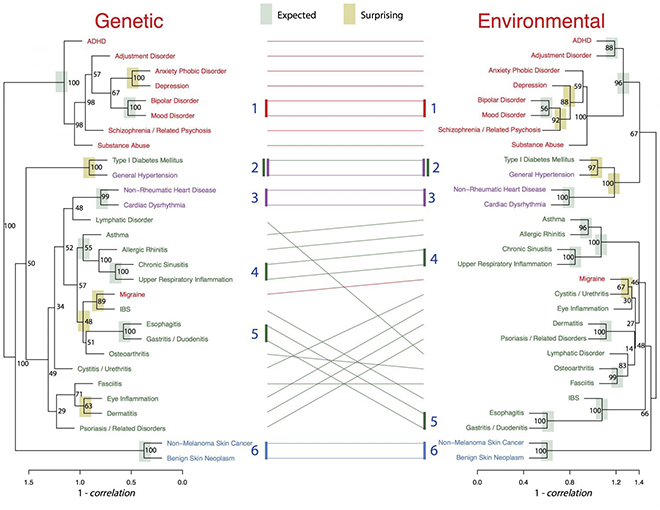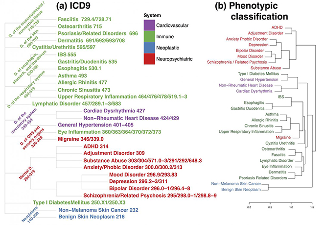 研究人员还将其结果与被广泛使用的国际疾病分类9版(ICD-9)比较,对疾病分组有了其它意外的发现。例如,1型糖尿病(一种自身免疫性内分泌疾病)与高血压(一种循环系统疾病)有很高的遗传相关性。研究人员还发现,在常见的、不同的疾病如哮喘、过敏性鼻炎、骨关节炎和皮炎等方面存在着高度的遗传相关性。