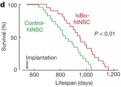 既然干细胞减少可能会影响小鼠的寿命,那么增加下丘脑里的神经干细胞,会不会延长小鼠的寿命呢?蔡教授的团队在小鼠的下丘脑内注射了两种不同的神经干细胞:第一种未经改造,注射后很容易就会死亡,相当于没注射;第二种经过了改造,注射后能存活很久。研究发现,后一种干细胞可以延长小鼠寿命达 10%。