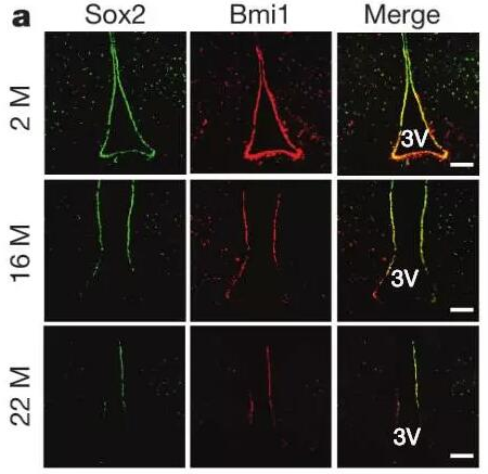 ▲下丘脑里的神经干细胞会随着时间流逝(从上到下)慢慢消失(图片来源:《自然》)