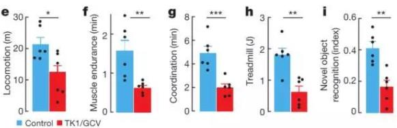这些干细胞数量减少,直接影响了衰老吗?为了回答这个问题,研究人员使用病毒,特异性地杀死了这些干细胞。后续结果表明,小鼠果然衰老得更快:他们的记忆力下降明显,肌肉出现了退化,耐力与协调力也差得不行。“干扰这些干细胞,极大加速了衰老速度,”蔡教授说:“这些神经干细胞被摧毁的小鼠,死得要比对照组更早。”