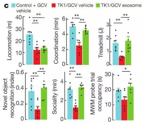 ▲外泌体的注射(绿色)使小鼠的多项运动能力和认知能力得到了提升(图片来源:《自然》)