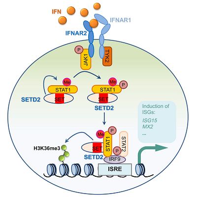 I型干扰素介导的相关基因的表达(ISGs)对于抗病毒免疫反应具有重要的意义,IFN信号的紊乱会导致一系列感染性疾病以及炎症紊乱的发生。到目前为止,我们对IFNa介导的信号通路已经有了较为深入的了解,但IFNa是如何激活STAT的信号以及ISG的表达目前并不清楚。除了磷酸化以及泛素化之外,蛋白质还存在其它一些少见的翻译后修饰类型,例如甲基化以及乙酰化等等。例如,NF-kB蛋白复合体中的RelA蛋白能够被甲基转移酶SETD6进行单甲基化修饰,进而抑制其转录调控的活性。然而,甲基化修饰对于IFNa的信号传递究竟又怎样的作用目前也并不清楚。