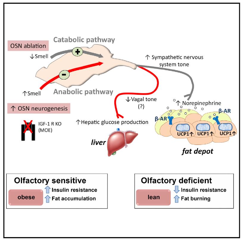 研究人员使用了基因疗法来破坏成年小鼠鼻中的嗅觉神经元,但是不影响干细胞,因此小鼠只是暂时失去嗅觉。嗅觉缺陷的小鼠通过上调其交感神经系统迅速燃烧卡路里。它们的白色脂肪细胞缩小,米色脂肪细胞被转变成棕色脂肪细胞,燃烧脂肪酸产生热量。(注:白色脂肪的主要作用是将体内多余能量以脂肪的形式储存起来,形成通常人们所不愿看到的肥胖,而棕色脂肪能将脂肪转化为热量。)
