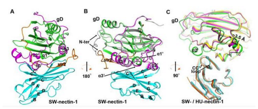 中国科学院微生物研究所高福团队与严景华课题组在前期研究中已经解析了 I 和 II 型单纯疱疹病毒(HSV)gD 与其受体 nectin- 1 的复合物结构,发现 HSV gD 蛋白结合于 nectin- 1 分子二聚化的接触面上。这一结合模式破坏了 nectin- 1 自身的二聚化,进而削弱了细胞粘附,有利于病毒入侵(Nature Communications2011;Journal of Virology 2014)。同时还阐明了 HSV 病毒另一关键糖蛋白 gB 与受体 PILRa 相互作用机制(PNAS 2014)。