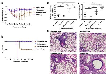 腺病毒载体是一种极具应用前景的疫苗载体,广泛应用于各种基础研究和临床试验。中国科学院上海巴斯德研究所抗感染免疫与疫苗课题组博士研究生王祥等在研究员周东明指导下,利用黑猩猩型腺病毒AdC68为载体,设计了新型H7N9禽流感疫苗,即H7N9-H7HA,同时设计了H7N9 DNA疫苗pCAGGA-H7HA作比较研究。H7N9-H7HA单剂量免疫后,即可在小鼠及豚鼠体内诱导出高强度的特异性体液免疫和细胞免疫。并且,免疫小鼠100%可拮抗致死剂量H7N9病毒的攻击感染。免疫血清被动转移试验和CD8+ T细胞清除试验证明HA特异性体液免疫和细胞免疫反应对免疫保护都起重要作用。该研究为新型禽流感疫苗的研究和禽流感疫情的防控提供了新策略。