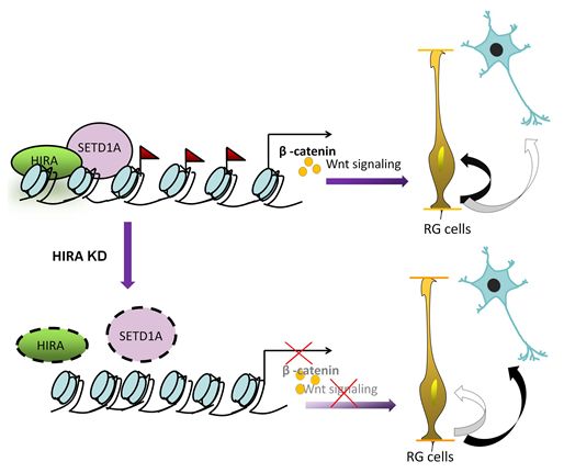 中国科学院动物研究所焦建伟研究组通过体内电转及体外转染的手段,观察 HIRA 敲低后对于神经前体细胞增殖和分化以及细胞形态的影响,发现 HIRA 在神经前体细胞中表达,且 HIRA 敲降减少了前体细胞增殖,增加了末端分化以及细胞循环的退出,最终导致了未成熟的神经元的分化。除此之外,研究人员发现 HIRA 能招募 H3K4 三甲基转移酶 Setd1A,增加了 H3K4me3 水平,加强了 beta-catenin 启动子的活性,从而增加了 beta-catenin 的表达。重要的是,过表达 HIRA,HIRA 的 N 端以及 beta-catenin 能够回救 HIRA 敲降造成的神经发生的异常。这些数据表明 HIRA 与 Setd1A 协调作用调控了 beta-catenin 的表达并且调控了神经发生。以上发现建立了“组蛋白密码”识别新机制,拓展了表观遗传修饰的外延,为脑发育以及疾病探索提供了非常新颖的表观遗传调控机理。