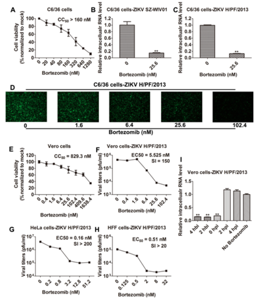 随后的功能研究表明泛素 - 蛋白酶体系统在 ZIKV 的进入过程中起重要作用,针对泛素 - 蛋白酶体的 FDA 成品药 Bortezomib 能够在 nM 级别有效抑制 ZIKV 复制(图 2),小鼠活体实验表明 Bortezomib 能够在体内降低 ZIKV 的载量并缓解 ZIKV 引起的病理损伤。 该研究首次绘制了宿主细胞对 ZIKV 感染的应答图谱,明确指出泛素蛋白酶系统在寨卡病毒感染过程中起关键作用,并发现 FDA 批准的药物 Bortezomib 在蚊源细胞和人源细胞上都能够抑制寨卡病毒(nM 级别),随后小鼠实验表明 Bortezomib 能在 in vivo 水平有效抑制病毒的复制并缓解病毒引起的病理损伤,为阻断 ZIKV 的转播以及治疗 ZIKV 感染提供了一个候选药物。
