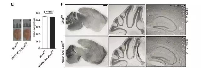 研究表明,上述有运输能力的蛋白叫做动力蛋白激活蛋白(dynein-dynactin),它通过与适应蛋白(adaptor)互相作用,保证运输的正确抵达,SNX6正是adaptor蛋白的一种。从这些信息中,我们不难看出SNX6这类蛋白的重要性,那么这种蛋白对树突的稳定性、突触联系的作用是什么?目前并不清楚,但是又十分重要。现在,我们对这一问题有了新的理解,中科院遗传所的刘佳佳团队及南京大学石云团队近期在eLife杂志发表了他们的最新研究[1],利用SNX6敲除鼠,系统地研究了SNX6对于树突的稳定性和突触传递强弱的影响。文章结果:1. 作者首先利用Nestin-Cre构建了中枢神经系统特异性SNX6基因敲除的小鼠,结果发现敲除鼠的脑体积和结构没有明显变化(图1)。