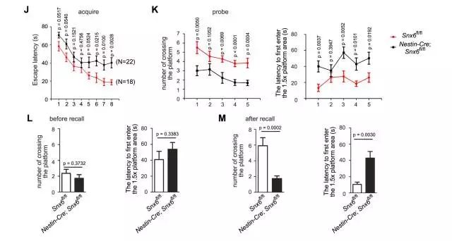 图1 中枢神经系统SNX6敲除不改变脑结构通过检测小鼠的行为,作者发现其空间学习和记忆的能力发生了损伤(图2),这说明SNX6蛋白对于空间学习记忆能力很重要。