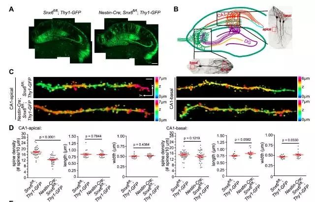 图3 SNX6缺失引起CA1锥体细胞远端树突棘密度的下降