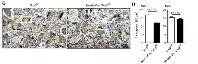 图2 中枢神经系统SNX6蛋白敲除引起海马依赖的空间学习记忆能力损伤2. SNX6缺失引起CA1锥体细胞远端树突棘密度的下降由于SNX6与突触结合的功能密切相关,接下来作者检测了SNX6敲除鼠树突棘的形态。结果发现,CA1锥体细胞远端树突棘的密度明显下降(图3),且兴奋性突触的数目也明显下降(图4)。