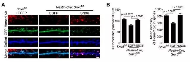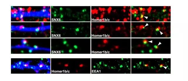 图4 SNX6缺失引起CA1锥体细胞兴奋性突触联系数目下降过去已知,SNX6能够与Homer1b/c相互作用,Homer1b/c是一种突触后脚手架蛋白,其对于突触后致密带蛋白的分布很重要,也影响着树突棘的形状。作者也对此作用进行了研究,发现SNX6确实与Homer1b/c互相作用,两种蛋白能够在细胞内体(Endosome)共定位(图5)。而敲除SNX6则会引起Homer1b/c在远端树突的分布下降(图6)。