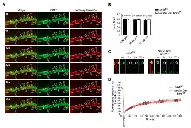 图6 敲除SNX6则会引起Homer1b/c在远端树突的分布下降SNX6通过哪些机制调节Homer1b/c的分布的呢?通过实验,作者发现Homer1b/c从树突主干到树突棘的转移不依赖于SNX6(图7),敲除SNX6并不影响Homer1b/c的转移。