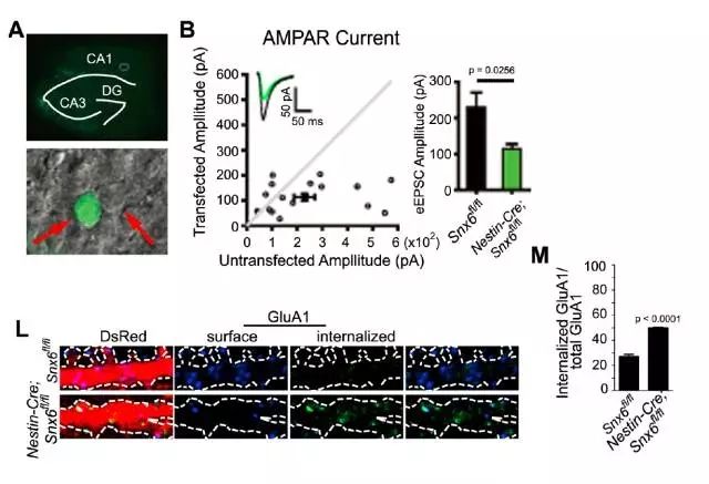 图7 Homer1b/c向树突棘的转移不依赖于SNX6通过上述实验,作者得知了敲除SNX6会影响Homer1b/c,那么这种影响会不会对突触传递产生损害?接下来,借助电生理与AAV-EGFP-2A-Cre手段,研究SNX6对突触传递的影响。结果发现,SNX6的缺失会损伤AMPA受体介导的突触传递,且降低了表面AMPA受体的数目(图8)。