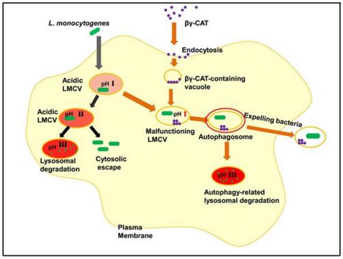 张云组前期从两栖动物大蹼铃蟾 (Bombina maxima) 中发现了脊椎动物第一个新型孔道形成蛋白和三叶因子复合物 betagamma-CAT (发明专利 ZL200810058028.5),并发现该内源性蛋白质机器具有刺激细胞囊泡化形成的特性,在细胞内吞 / 溶酶体途径中形成膜通道并激活炎症小体(PNAS 2014,111,6702,封面故事)。李盛安和刘龙等研究人员进一步深入揭示该复合物具有调控细胞内囊泡酸化环境的功能。在宿主免疫防御中,以细胞内病原体单核增生李斯特菌(Listera monocytogenes)为模型的研究表明,该蛋白质机器可以限制李斯特菌从胞内囊泡的逃逸,并同时激发细胞外排驱逐胞内感染的病原体,有效抵御致死性的李斯特菌感染。