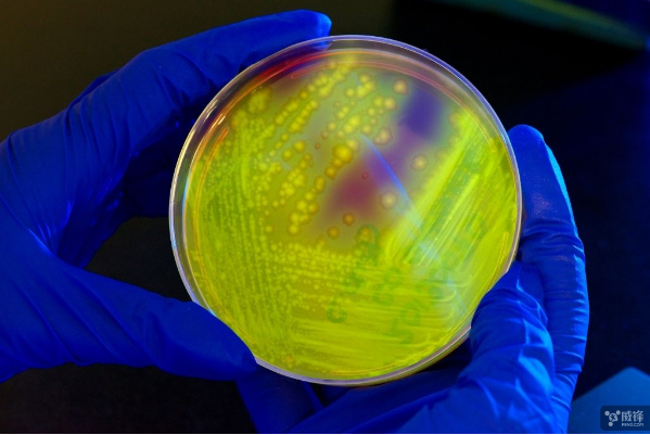 培养皿中的难梭状芽胞杆菌在长波紫外光下发光