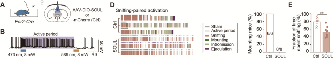 为了进一步区分BNSTEsr2神经元是可以抑制交配行为还是交配动机,在雄鼠中,研究人员表达了具有超高光敏感性的视蛋白(SOUL),并在不同的交配阶段进行了经颅光学刺激非侵入性地激活BNSTEsr2神经元。实验发现在嗅探阶段而不是交配开始以后激活BNSTEsr2神经元可以抑制正常雄性小鼠交配起始,这些发现进一步表明BNSTEsr2神经元在抑制交配动机而不是交配动作方面发挥了重要的作用(图5)。