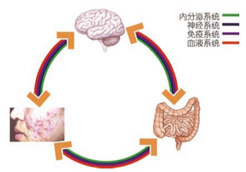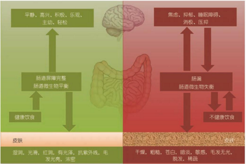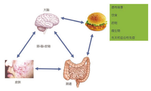 图 3:饮食与肠 - 脑 - 皮轴的关系已有研究表明,皮肤疾病与精神疾病具有共病性,基础和临床研究发现精神心理因素对皮肤病发病有影响作用。如心理应激会加重多种皮肤疾病,特别是特应性皮炎、银屑病、脂溢性湿疹、结节性痒疹、扁平癣、慢性荨麻疹、斑秃和瘙痒等。此外,肠道微生物可影响皮肤疾病的发生,并且精神状态与肠道微生物状况可反映皮肤健康状况。反之,皮肤状况也可作为精神状态和肠道微生物状况的评估参照。但是,皮肤疾病、精神疾病与肠道微生物之间的关系有待进一步研究。中国科学院心理研究所心理健康重点实验室金锋研究组通过研究发现:患有心理和精神疾病的人群同时患有皮肤问题的比例非常高,通过检测肠道微生物组成发现这些人的肠道共生微生物的组成与健康人存在明显不同。在实施了针对肠道微生物的干预措施后,随着肠道共生微生物良好状态的恢复,患者的精神状态和皮肤症状均会随之改善。科学家将肠道状态、肠道微生物以及心理疾病与皮肤疾病的关联称作肠道 - 大脑 - 皮肤轴(简称肠 - 脑 - 皮轴,gut-brain-skin axis)(图 1)。他们从人体共生微生物的角度分析了皮肤病的发病机理,提出围绕肠 - 脑 - 皮轴来寻找皮肤病的发病原因,并以此进行皮肤疾病的预防和干预,或将成为未来治疗此类疾病的重要方向(图 2)。饮食是通过肠 - 脑 - 皮轴影响皮肤的重要因素。不当饮食可直接引起痤疮,而通过服用乳杆菌可抑制由压力引起的皮肤炎症。益生菌具有改善肠道屏障功能、恢复肠道微生态健康、刺激宿主免疫系统和对抗炎症等作用,在皮肤疾病的防治方面有一定作用(图 3)。该研究提示,皮肤不仅是人的第一道免疫防线,也是精神状态和肠道微生物健康状况的晴雨表。肠道微生物、肠道、大脑和皮肤并不各自独立,而是相互密切关联的复合系统。未来皮肤病的治疗趋势是采取多种影响肠 - 脑 - 皮轴的干预措施,综合运用饮食、益生菌、益生元、药物和心理干预等方式。该研究为日益增多的皮肤和精神疾病提供了新颖而清晰的干预和治疗方向,具有重要的理论和应用价值。
