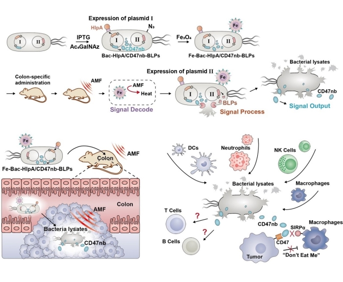 在本工作中,研究团队借助磁性纳米材料的磁热效应,创新实现交变磁场对体内细菌基因表达和药物释放行为的时间-空间精准操纵,最终实现肿瘤的精准免疫治疗。修饰在肿瘤靶向菌表面的顺磁性Fe3O4纳米颗粒使其能够接收磁信号并将其转化为42oC热量,在热敏启动子的控制下启动裂解蛋白的表达,实现细菌的裂解和药物蛋白(抗CD47纳米抗体)的释放。同时,本工作发现并阐明工程菌裂解物的强大免疫原性能够有效激活抗原提呈细胞的I型干扰素通路,与CD47阻断疗法产生协同抗肿瘤效果,将CD47“别吃我”信号介导的天然免疫强化为CD8+ T细胞介导的适应性抗肿瘤免疫反应,对原位结肠肿瘤以及远端肿瘤产生强大的抗肿瘤作用。