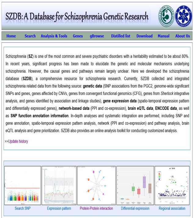 为了给上述问题提供一个可能的解决方案,同时也为研究者提供一个易于使用和查询的数据资源平台,罗雄剑课题组和姚永刚课题组合作,开发构建了精神分裂症的遗传数据库SZDB(http://www.szdb.org)。SZDB收集了众多与精神分裂症相关的数据,包括遗传研究数据(如来自于遗传连锁和关联研究、GWAS、外显子组测序、拷贝数变异、整合分析等的数据)、基因表达数据(包含差异表达和时空表达模式的数据)、网络数据(蛋白相互作用和共表达网络)、大脑eQTL数据以及SNP功能注释数据等。通过对这些不同层面的数据进行整合和分析,我们鉴别到一些重要的精神分裂症候选基因。