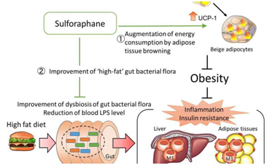 进一步的研究揭示出:(1)萝卜硫素增加解偶联蛋白-1(UCP-1)的水平,加快白色脂肪组织棕色化(即白色脂肪组织转化为棕色脂肪组织),从而促进能量消耗增加和脂肪燃烧;(2)萝卜硫素降低肠道中的Desulfobivrionaceae细菌(这类细菌过量产生一种被称作脂多糖的内毒素)的相对丰度,因而降低血液中的这种内毒素的水平,从而减轻代谢性内毒素血症。