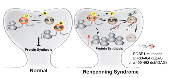 2017年1月10日,国际知名遗传学杂志《human molecular genetics》上正式发表东南大学生命科学研究院“发育与疾病相关基因”教育部重点实验室韩俊海课题组题为Mutations of PQBP1 in Renpenning syndrome promote ubiquitin-mediated degradation of FMRP and cause synaptic over-growth的研究论文。博士研究生张晓艳为论文的第一作者,通讯作者为张子超副研究员。Renpenning 综合征是一类x染色体连锁的精神发育迟滞疾病,主要由多聚谷氨酰胺结合蛋白1(Polyglutamine binding protein 1,简称PQBP1)基因突变引起,但分子功能和致病机理目前还不完全清楚。本项研究中检测了在病人中高发的几例PQBP1不同位点突变(c.461_462delAG,c.459_462delAGAG,c.463_464dupAG)的分子以及突触功能,解析其致病机制。结果表明,与PQBP1正常形式相比,c.459_462delAGAG和c.463_464dupAG突变会产生一段全新的C末端序列,与非磷酸化形式的FMRP有强亲和力,促进FMRP通过泛素化途径降解,进而导致FMRP下游靶标MAP1B的上调以及神经元突触可塑性变化。此外,研究中选取果蝇神经肌肉接头(NMJ)作为在体模型,同样证实PQBP1 c.463_464dupAG转基因果蝇呈现出明显的内源dFMRP下调以及突触过度生长的缺陷。此项研究发现了Renpenning 综合征的全新分子致病机理,即PQBP1 c.459_462delAGAG和c.463_464dupAG突变后下调FMRP,为治疗Renpenning 综合征提供新的治疗策略。