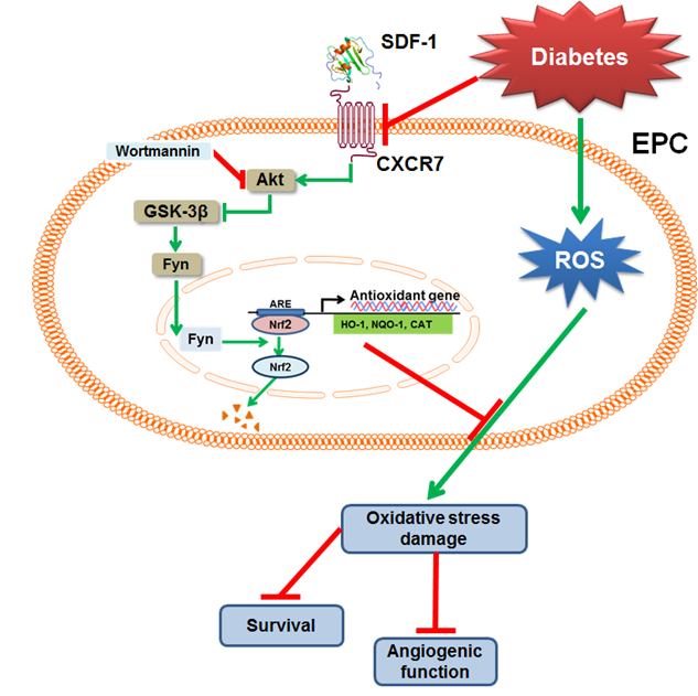 图 SDF-1/CXCR7 在糖尿病 EPCs 中的作用示意图。糖尿病降低 EPCs 中 CXCR7 的表达,并抑制 Akt/GSK-3β/Fyn 信号介导的 Nrf2 核转位和下游靶基因的转录激活,从而引起氧化应激的增加,导致 EPCs 存活下降和血管生成功能受损。论文原文:Elevating CXCR7 Improves Angiogenic Function of EPCs via Akt/GSK-3β/Fyn-Mediated Nrf2 Activation in Diabetic Limb Ischemia