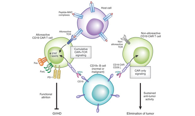 Michel Sadelain 和 Marcel R M van den Brink 的研究结果说明了一个事实:同种异体供体 CD19 特异性的 CD28z-CAR-T 细胞在促进抗淋巴瘤活性的同时, 所导致的 GVHD 发生的风险是最少的。这项研究结果支持这样的一个模型:具有同种异体反应的 CD28z-CAR-T 细胞由于受到双特异性的 TCR 和 CAR 信号刺激,经历累积激活之后,导致 T 细胞功能损失以及这些效应细胞的被清除。上述研究结果进一步表明,预先存在的 CD19 + 靶细胞会介导对 CD28z-CAR-T 细胞可能引起的 GVHD 的抑制,并表明在患者完成移植后,如果等到 B 细胞比例恢复后再进行供体 CD28z-CAR-T 细胞的回输,将最大程度减少 GVHD 发生的风险。