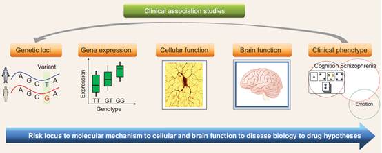 通过对近年来精神疾病遗传学、功能基因组学、神经分子生物学领域及人类脑组织转录组测序研究的系统整理和分析,李明研究员和Daniel R. Weinberger教授为National Science Review《国家科学评论》撰写了专题综述,阐述了当前在精神分裂症功能基因组学领域的研究思路,建立了基于遗传学数据开展深入分析的转化医学研究模板(图1)。