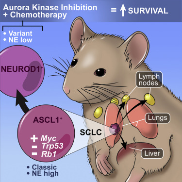 研究人员分析了C-MYC肿瘤的特性,随后发现一些药物可能会对这种类型的小细胞肺癌起效,一种叫做Aurora激酶抑制剂的药物与化疗药物联合使用能够改善癌症小鼠模型的治疗结果。
