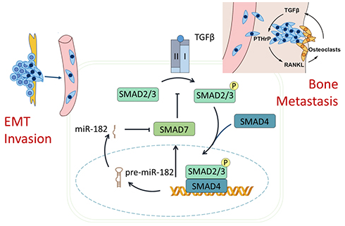 TGFβ可以促进肿瘤细胞miR-182的转录,而miR-182通过靶向抑制SMAD7的翻译阻断对TGFβ的负反馈调节,引起肿瘤细胞TGFβ的持续增强,促进TGFβ引起的癌细胞上皮-间充质转化及肿瘤侵袭,以及在骨中肿瘤-破骨细胞的互作和骨转移灶形成。