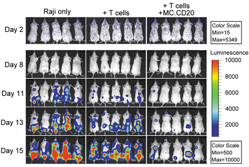 B细胞淋巴瘤Raji细胞携带荧光基因,图中治疗组(T Cells+MC.CD20)小鼠荧光强度显著少于对照组(Raji only和T cells),表明微环DNA表达抗-CD3/CD20抗体大大降低瘤负荷,有显著疗效