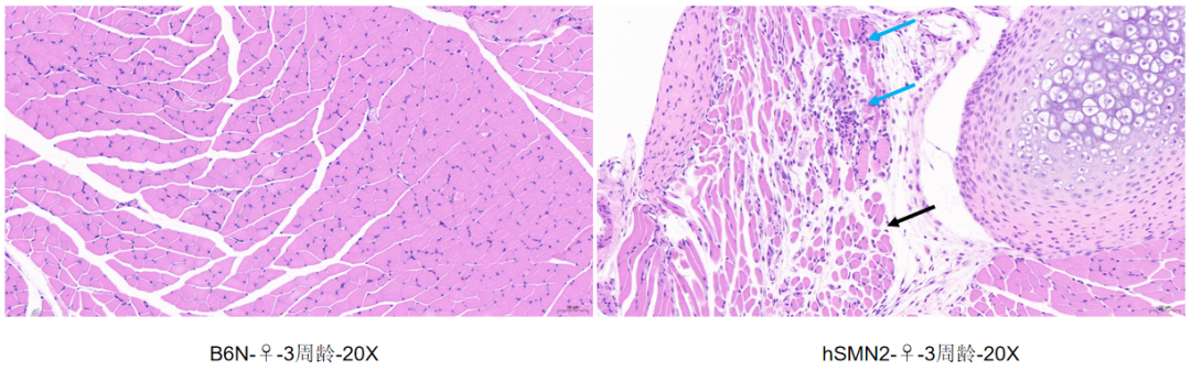 相对于B6N野生型小鼠,hSMN2小鼠肌肉组织可见少量肌细胞坏死,胞质崩解,伴有极少量的淋巴细胞浸润(蓝色箭头),周围可见肌细胞萎缩,体积减小,肌细胞间隔增宽,排列疏松(黑色箭头)。
