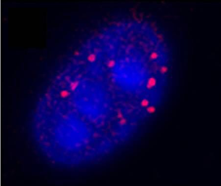 在来自一种早发型亨廷顿舞蹈症小鼠的骨骼肌纤维中,编码突变huntingtin的RNA(红色)在细胞核(蓝色)中形成聚集点(foci)。