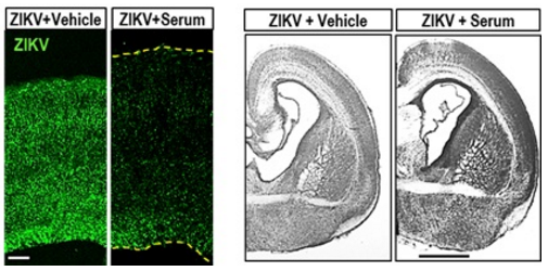 许执恒研究团队与多个单位(包括军科院秦成峰团队)通力合作进行了药物筛选和相关研究,最终许执恒研究组发现含有高滴度中和性抗体的寨卡病人康复期血清,可防治病毒感染胎儿的大脑,预防小头畸形症的发生。通过颅内注射的方法让胎鼠大脑感染寨卡病毒,并在感染后注射病人康复期血清。许执恒研究组发现,康复期血清中的中和性抗体在体外能够有效抑制寨卡病毒的复制;在体内能通过胎盘及血脑屏障,非常明显地减少胎儿大脑中的病毒数量,保护胎儿。因此,在小鼠模型上的研究表明,孕期感染寨卡病毒有望治愈。该研究为寨卡病毒感染的治疗提供了极为重要的线索。