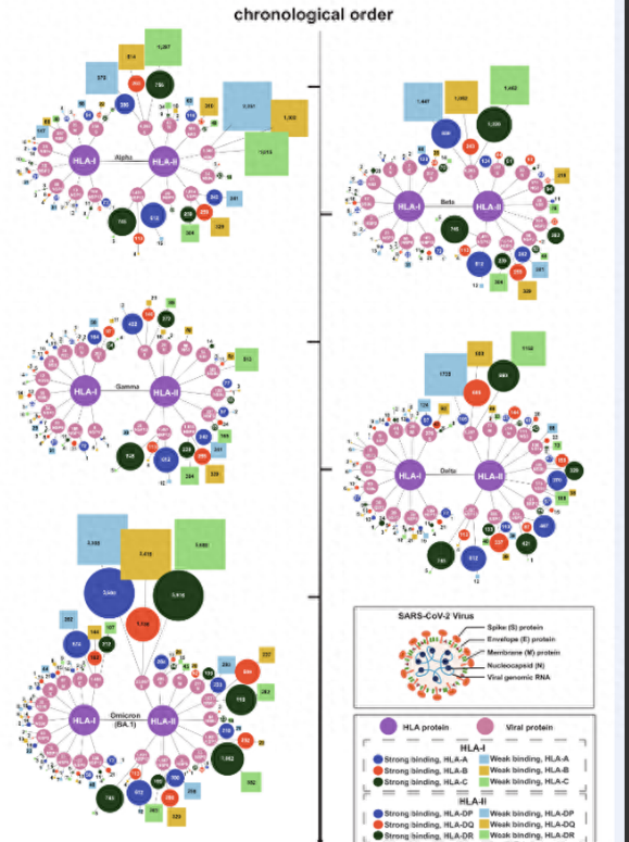 图1. 不同SARS-COV2毒株与蛋白质结合的HLA等位基因的累积数量.