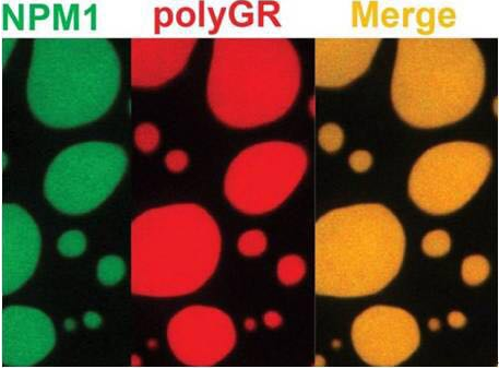 在与其正结合伙伴相结合时,核仁蛋白NPM1(绿色)发生相分离以形成液滴,这有助于核仁的组装和功能。ALS相关毒性蛋白polyGR(红色)会慢慢侵入这些液态结构并损害正常功能。
