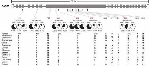 中国科学院昆明动物研究所宿兵实验室(助理研究员石磊、硕士研究生虎恩志)在近期的研究中发现脑容量调控基因CASC5在现代人的起源过程中积累了8个氨基酸突变,这些突变在非人灵长类和古人类(尼安德特人和丹尼索瓦人)中均不存在,是现代人特有的变异位点。其中,2个突变位点在现代人中已经固定下来,而其他6个位点在人群中仍然是多态的;更有意思的是有4个多态位点在东亚人群中呈现高频率,但在欧洲和非洲人群中频率很低。进一步的分子进化分析表明CASC5基因在东亚人群中受到达尔文正选择的作用,但在非洲和欧洲群体中没有发现选择信号。遗传关联分析显示这些东亚人群富集的位点在汉族人群中与大脑灰质体积显著相关,突变型等位基因的携带者具有更大的灰质体积。该研究结果提示在近期人类大脑进化过程中CASC5基因对现代人大脑形态结构的变化可能发挥重要作用。研究结果发表于国际核心期刊《Human Genetics》。
