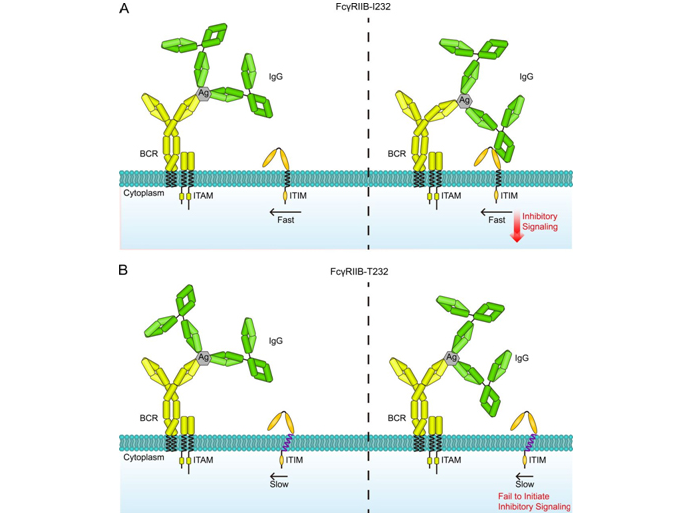 2016年11月1日,国际权威生物医学期刊Journal of Experimental Medicine在线发表了中国科学院上海生命科学研究院生物化学与细胞生物学研究所许琛琦研究组与清华大学刘万里研究组、龚海鹏研究组,北大人民医院栗占国研究组的合作论文“Impairment on the lateral mobility induced by structural changes underlies the functional deficiency of the lupus associated polymorphism FcγRIIB-T232”。提出了与红斑狼疮相关的单核苷酸多态性FcγRIIB-T232因其跨膜区在细胞质膜中呈现倾角增大的拓扑构象,导致其侧向布朗运动(二维扩散速率)降低,而无法有效发挥其抑制功能的新机制,导致B细胞异常活化。清华大学的刘万里教授为这项工作的通讯作者,龚海鹏、许琛琦、栗占国为共同通讯作者。刘万里课题组博士后徐利玲是本文的第一作者,共同一作包括:清华大学博士生夏梦蝶、生化与细胞所博士生郭俊、北大人民医院博士后孙晓麟。在这项新的研究中,四个研究团队紧密合作,综合利用细胞生物学、生物化学和生物物理学等不同学科的交叉优势,运用单分子成像示踪、超分辨率成像、分子拟合及核磁共振等技术,从FcγRIIB的跨膜区结构及其在细胞质膜上的侧向分子扩散速率角度提出了I232T的单核苷酸多态性导致FcγRIIB-T232抑制功能缺失的新机制。该论文发现FcγRIIB-T232在细胞质膜表面的扩散速率显著低于FcγRIIB-I232,导致在免疫活化的启动阶段FcγRIIB-T232无法快速有效的扩散至被BCR捕捉的抗原抗体复合物微簇体中与抗体Fc区结合。分子拟合及核磁共振的结果表明FcγRIIB-T232跨膜区在磷脂双层中呈现更加倾斜的拓扑构象,进而解释FcγRIIB-T232扩散速率为何变慢。该研究通过检测FcγRIIB-T232跨膜区物理性质的改变为其抑制功能缺失提供了新机制。这一研究成果为微观分子物理性质对其宏观病理的发生发展提供了新思路,并为FcγRIIB-T232与系统性红斑性狼疮易感性正相关提供了一定的理论依据,对系统性红斑狼疮疾病的个性化治疗,疾病进展判断及预后提供了参考依据。该项研究得到国家自然科学基金委,中科院和上海市的经费支持;数据收集工作得到国家蛋白质科学研究中心(上海)核磁共振系统的大力帮助。论文链接:http://jem.rupress.org/content/early/2016/10/26/jem.20160528