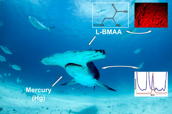 最近,科学家们在鲨鱼翅和鲨鱼软骨补充剂中发现含有BMAA。已知具有神经毒性的甲基汞会在鲨鱼漫长的生命历程中发生生物蓄积。