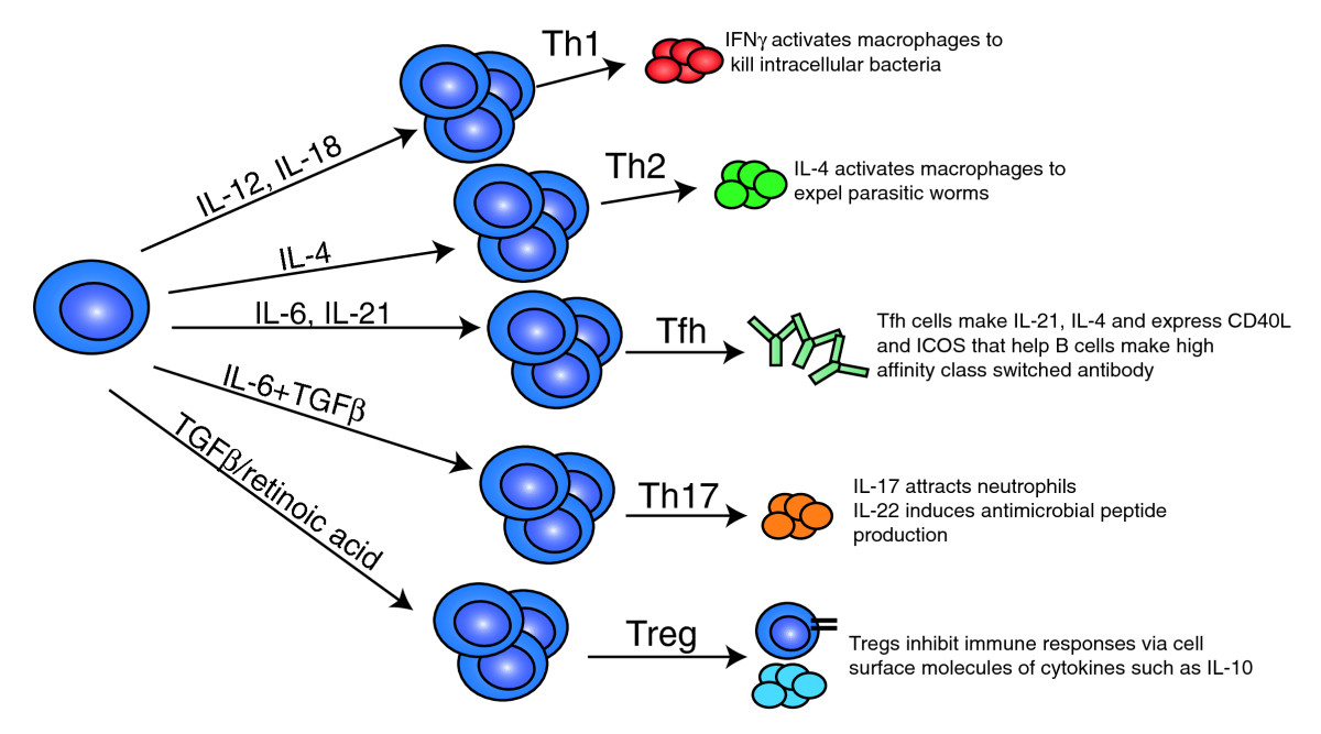 免疫系统功能多样,能够对数百种不同类型的传染病做出精细的反应。对感染后免疫应答的启动需要先天性免疫细胞(这是识别的一般功能的病原体)和适应性免疫系统的淋巴细胞(其高度可变的抗原受体能结合特定的病原体)之间的合作。T淋巴细胞的活化依赖于抗原递呈细胞(APCs)先天性免疫系统直接由病原体激活,将病原体吞噬和反刍后,再呈递给活化的T细胞。T细胞增殖,分化保护身体,通过激活其他免疫细胞或杀死受感染的细胞。由T淋巴细胞激活的免疫细胞中,最重要的是B淋巴细胞产生抗体的。T淋巴细胞决定B淋巴细胞分泌的抗体类型,和其他免疫细胞的活性,从而指导免疫反应,提供最佳地保护对抗不同类型的感染。