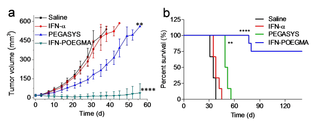 为了解决这些问题,高卫平实验室首次利用定点原位生长技术(SIG)合成干扰素-高分子偶联物(IFN-POEGMA)。该方法大幅度提高了产率,是PEGylation的60倍,能够有效降低生产成本。IFN-POEGMA的药代和生物分布与PEGylated IFN-a(派罗欣,PEGASYS)的相似,但是其体外生物活性是PEGASYS的7倍。动物实验结果表明,IFN-POEGMA不仅完全抑制了肿瘤的生长,而且治愈了75%的小鼠,而在同样给药剂量下PEGASYS仅能在一定程度上抑制肿瘤生长,但不能治愈小鼠(图2a和2b)。这些实验结果首次表明,通过SIG方法可以高效可控制备出比已在临床广泛使用的一线药物金标准(PEGASYS)更好的新型蛋白药物,具有巨大的临床转化前景和社会经济价值。高卫平实验室已为该研究成果申请了中国专利和国际专利,并获得了天使基金的投资,目前临床前第三方测试效果很好,将进行下一步临床前研究。