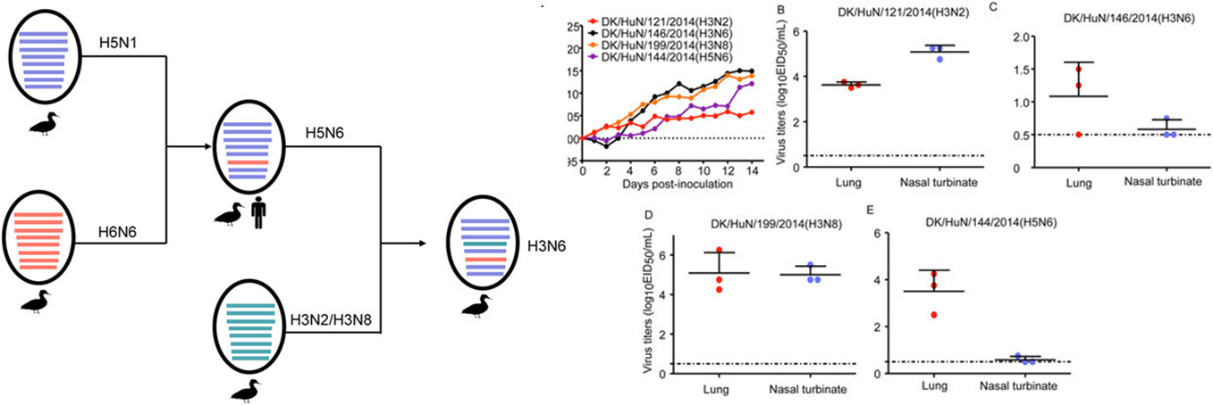 近期,中国科学院武汉病毒研究所崔杰研究员与兰州兽医研究所朱启运研究员、哈尔滨兽医研究所陈化兰研究员的团队合作,针对2014-2015年在湖南某禽养殖场及周边环境收集的流感病毒数据进行分析,发现了3株经由H5N6及其它亚型重配而来的新毒株H3N6。动物实验表明2年内当地流行的4种毒株(H3N2、H3N6、H3N8及H5N6)均有较低的致病力。近年来有报道H5N6能够引起人的感染,因此经其重配产生的毒株不容忽视。该毒株的发现为禽流感病毒的防控提供了新的素材。相关研究报道在线发表在自然出版集团旗下刊物Scientific Reports上。